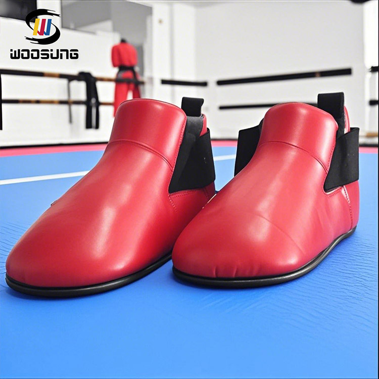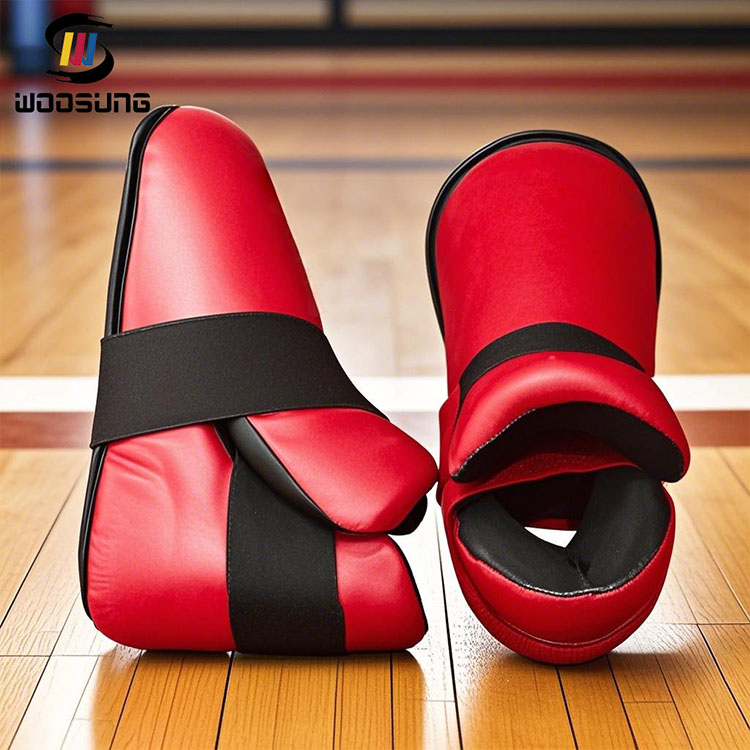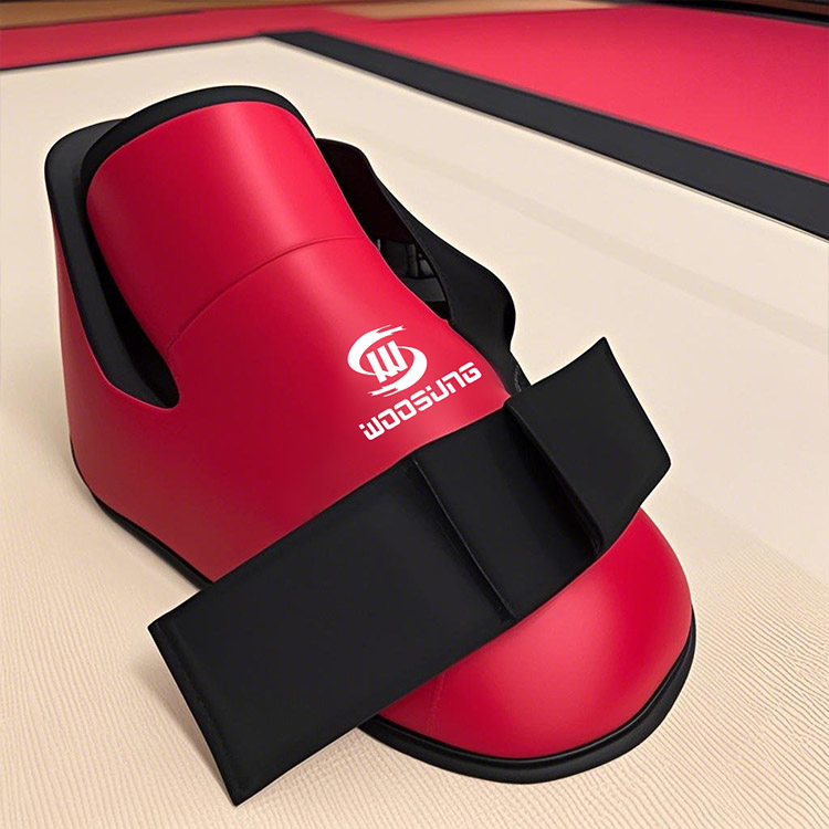 ה-WOOSUNG® ITF Taekwondo Foot Guard כולל חלק עליון מעור אדום בוהק עם קווים דקורטיביים שחורים, היוצרים ניגודיות צבע בולטת ומציגים אסתטיקה ויזואלית ייחודית.
