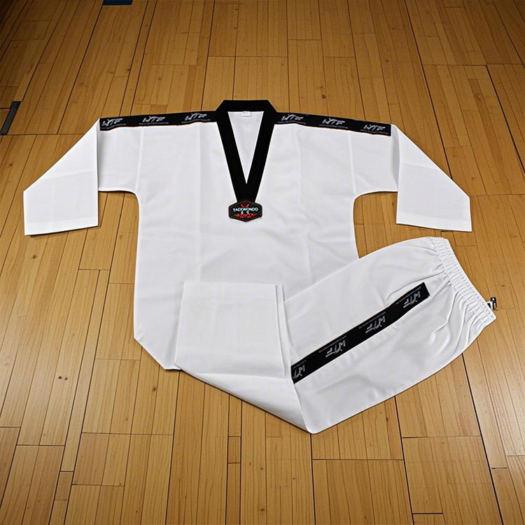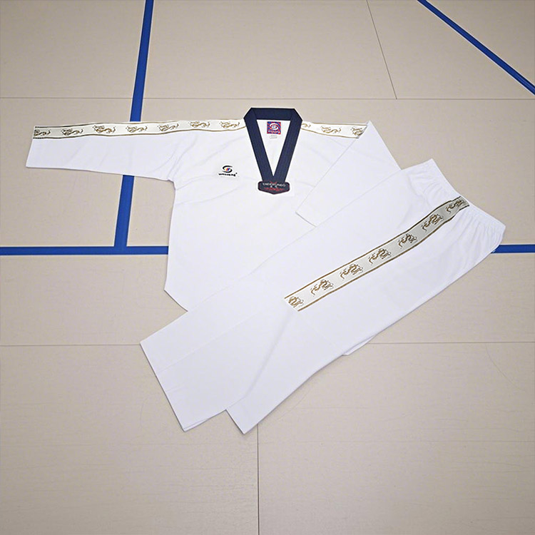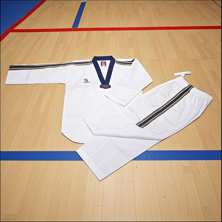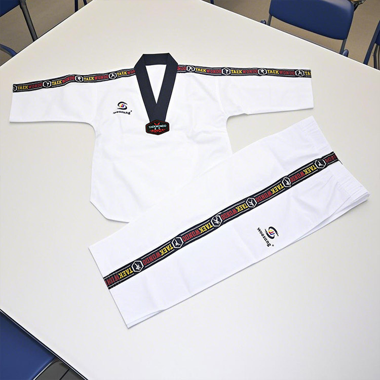 WOOSUNG היא יצרנית מקצועית של מדי טאקוונדו שונים. מדי הטאקוונדו המפוספסים שלנו עשויים מבד כותנה נושם, עם תפרים מחוזקים, רצועות שרוך במכנסיים ומגני ברכיים, מה שהופך אותם עמידים, גמישים ומתאימים לאימונים ותחרויות.