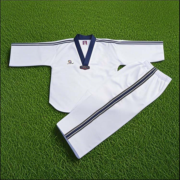 מדי טאקוונדו עם פסים אלה כוללים עיצוב לבן פריך עם צווארון V שחור ודגשים ייחודיים של פסים אדומים, לבנים וכחולים על השרוולים ורגלי המכנסיים. מותני השרוך המאובטחים והתפרים המחוזקים מבטיחים עמידות ותנועה בלתי מוגבלת, בעוד שסמל החזה מוסיף מגע אותנטי. בשילוב עם חגורת דרגה כחולה, זה אידיאלי הן לאימונים יומיים והן לאירועים תחרותיים.